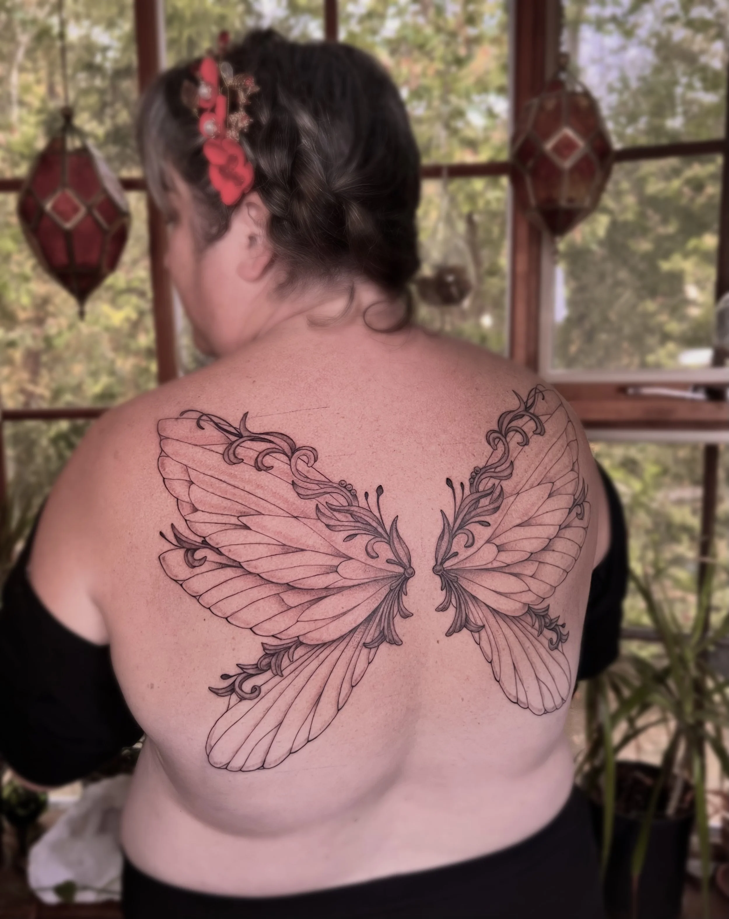 Tattooing Since 2011. Specializing in illustrative tattoos. Wings, Dragons, plants, animals, flowers, creatures, earthly and magical. Black and grey and color. Fine lines and bold. Trained in medical tattooing for 3D Areola tattoos. 18+ only for booking