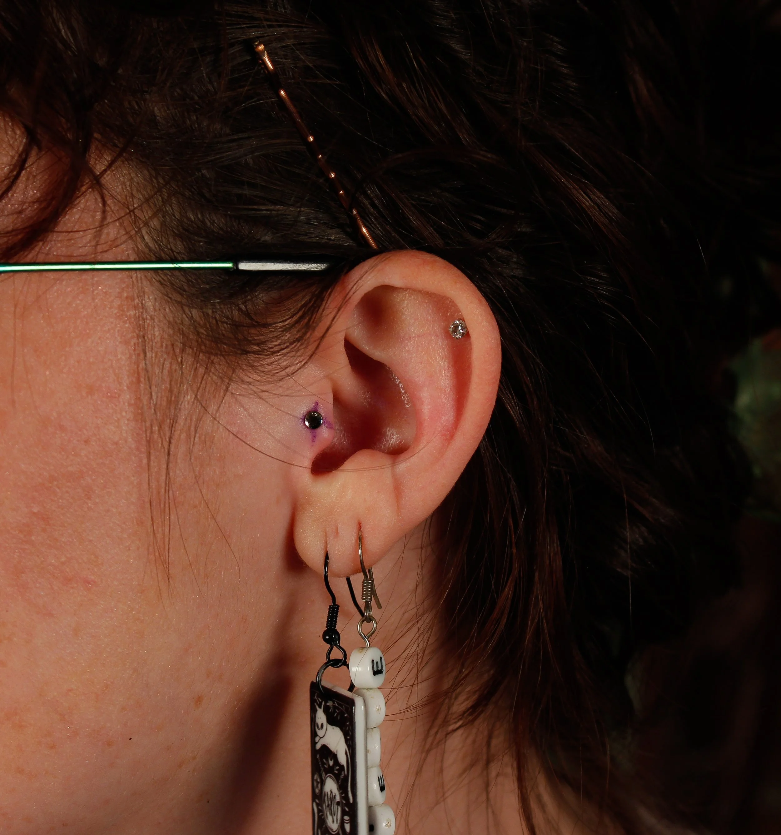 Eliot Wild, a professional body piercer at Earthbound Ink. Offers a range of services from standard piercings, ear projects, styling, anodizing, tapering, kids ear piercing and more advanced piercing projects. Eliot creates a safe and relaxing atmosphere for all bodies. He is happy to answer any questions and remains available after your appointments should you need any additional assistance with your healing. As part of his service in this industry, he attends seminars and stays up to date with recommendations from the APP and other leaders in the industry. With a skilled eye for symmetry and aesthetic placement Eliot can help you determine the best placement for your next jewelry addition.