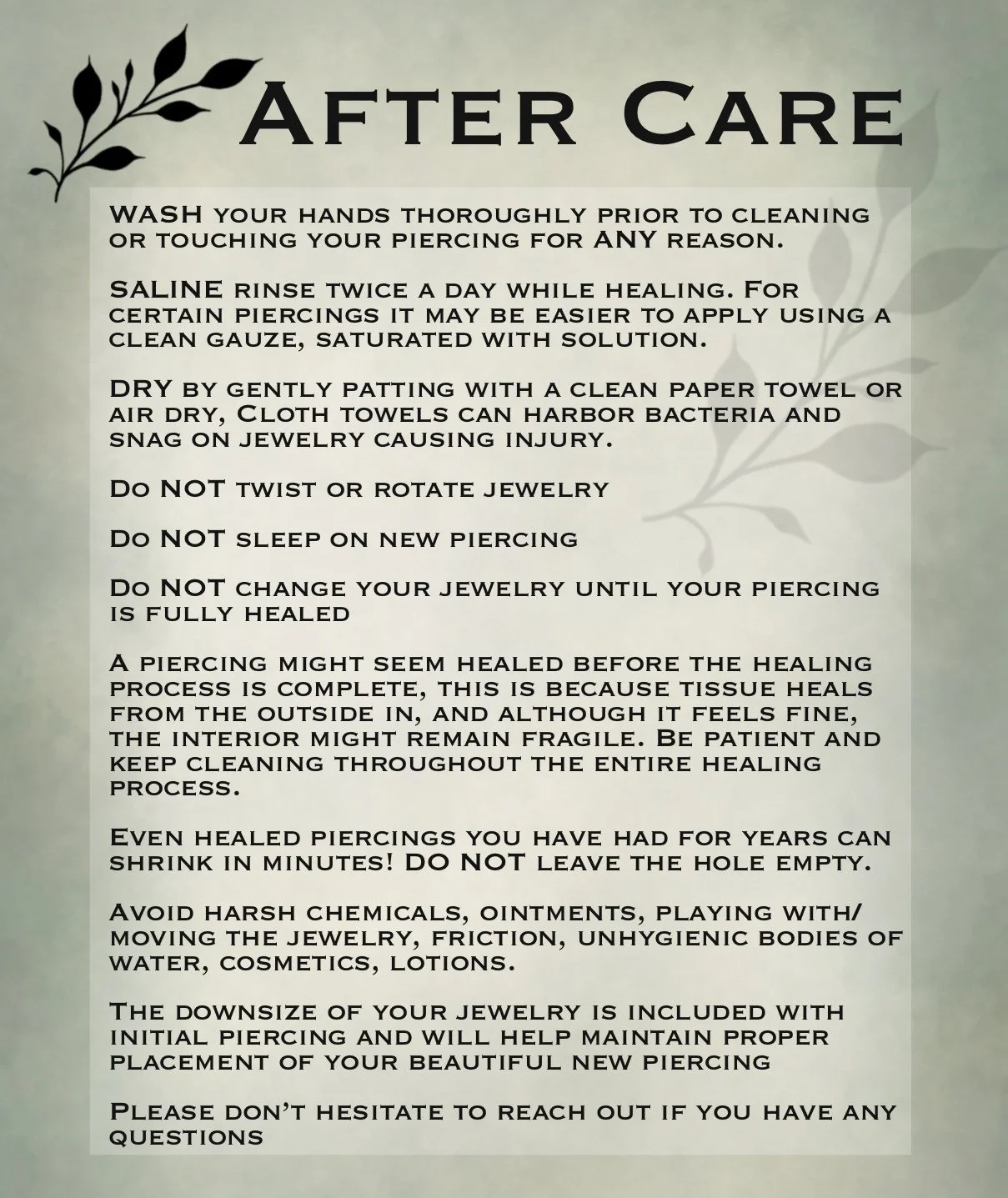 We get asked this one a lot, although we do everything we can to make sure your visit here is as comfortable s possible, it’s good to expect some pain to be involved. Clients often tell us that the anticipation was worse than the procedure. Some tenderness may be expected afterwards and will lessen as swelling goes down and tunnel heals. Follow your aftercare and come in for the recommended downsize (included) for maximum comfort.